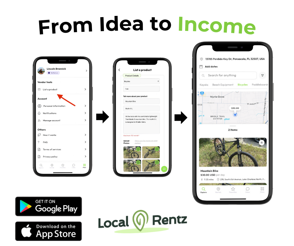 PENSACOLA, FL, UNITED STATES, December 9, 2025 /EINPresswire.com/ -- Local Rentz, the pioneering peer-to-peer "rent anything" marketplace app, today announced the launch of its new "Instant List" feature, enabling users to list items for rent directly from their mobile devices for the first time. This crucial update completes the company's vision of a fully mobile, community-driven rental ecosystem, allowing anyone to turn idle bikes, kayaks, or gear into a side gig with just a few taps.